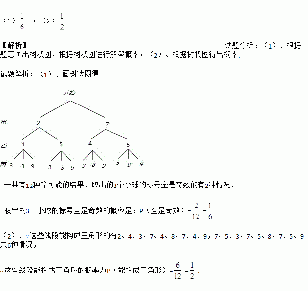 甲口袋中装有两个相同的小球,它们的标号分别为2和7,乙口袋中装有两个相同的小球,它们的标号分别为4和5,丙口袋中装有三个相同的小球,它们的标号分别为3,8,9.从这3个口袋中各随机地取出1个小球.