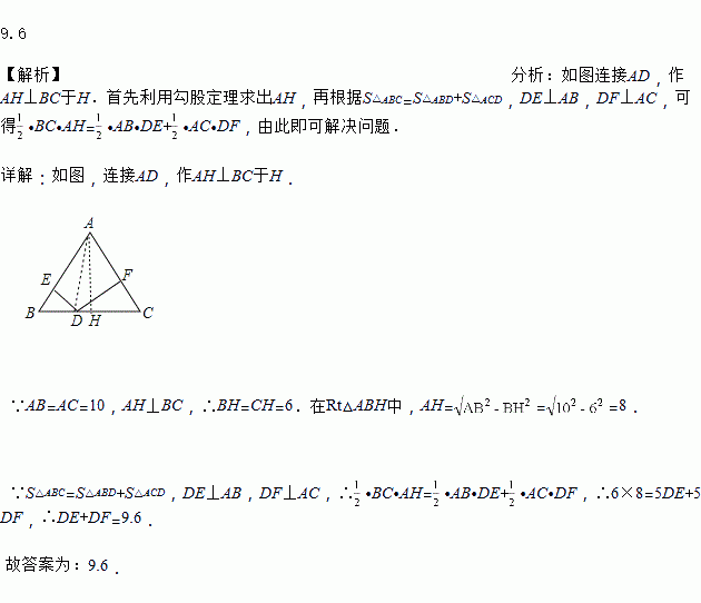 在等腰三角形ABC中,AB=AC=10,BC=12,D为BC边上的任意一点,过点D分别作DE⊥AB,DF⊥AC,垂足分别为E,F,则DE+DF=______.