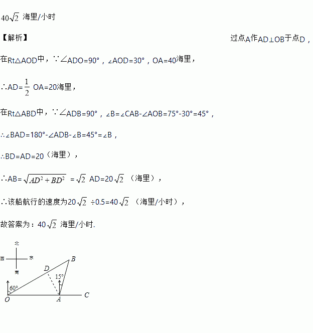 如图,港口A在观测站O的正东方向,OA=40海里,某船从港口A出发,沿北偏东15°方向航行半小时后到达B处,此时从观测站O处测得该船位于北偏东60°的方向.求该船航行的速度______.