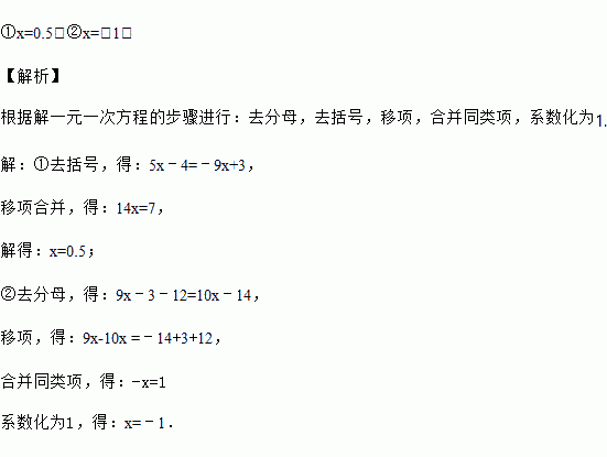 解方程 ①5x﹣4=﹣3(3x﹣1);②﹣1=.