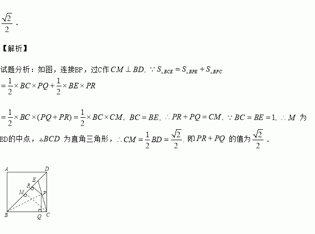 如图,E是边长为1的正方形ABCD对角线BD上一点,且BE=BC,P为CE上任意一点,PQ⊥BC于点Q,PR⊥BD于点R,则PQ+PR的值为 。