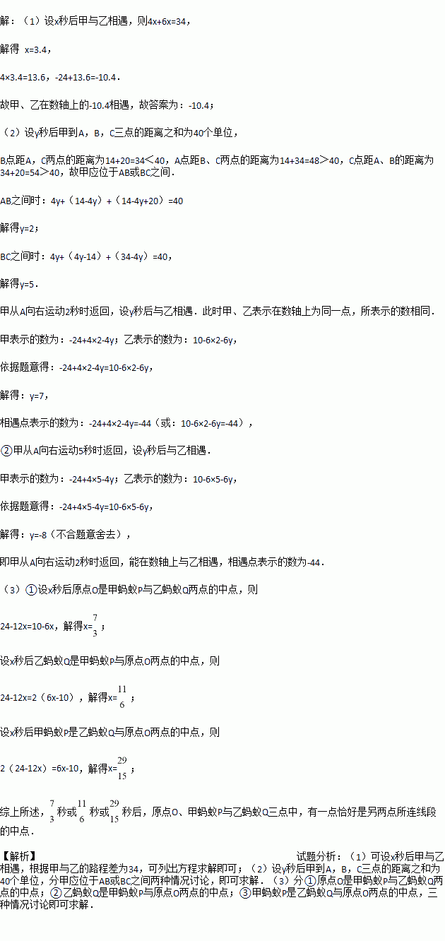 已知数轴上有A,B,C三点,分别表示数﹣24,﹣10,10.两只电子蚂蚁甲、乙分别从A,C两点同时相向而行,甲的速度为4个单位/秒,乙的速度为6个单位/秒.