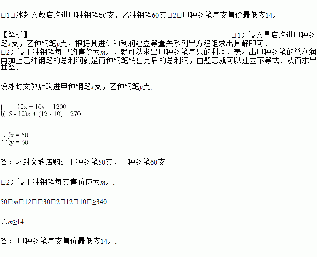 冰封文教店用1200元购进了甲、乙两种钢笔,已知甲种钢笔进价为每支12元,乙种钢笔进价为每支10元。在销售时甲种钢笔售价为每支15元,乙种钢笔售价为每支12元,全部售完后共获利270元。