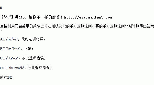 A. a2•a3=a6 B. (a2)2=a4 C. a8÷a4=a2 D. (ab)3=ab3