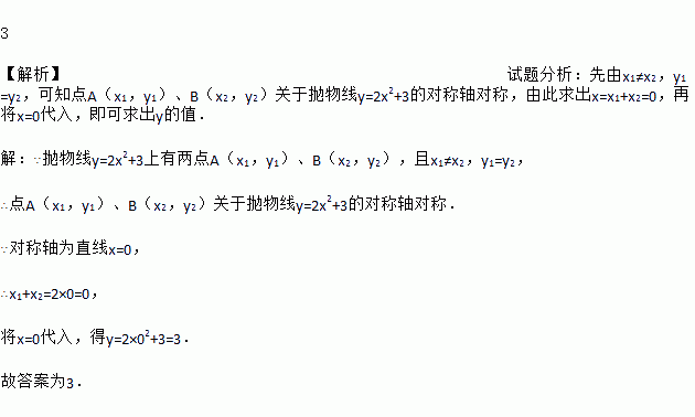 抛物线y=2x2+3上有两点A(x1 , y1)、B(x2 , y2),且x1≠x2 , y1=y2 , 当x=x1+x2时,y=________.