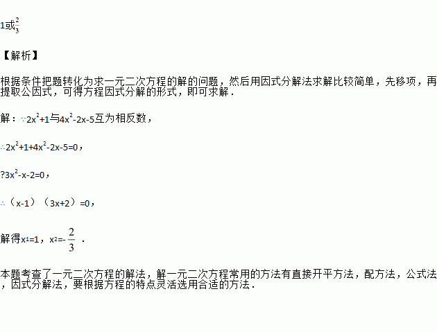如果2x2+1与4x2-2x-5互为相反数,则x的值为________.