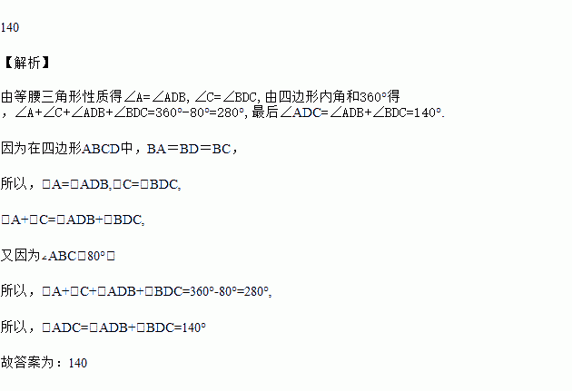 如图,在四边形ABCD中,BA=BD=BC,∠ABC=80°,则∠ADC=____°.