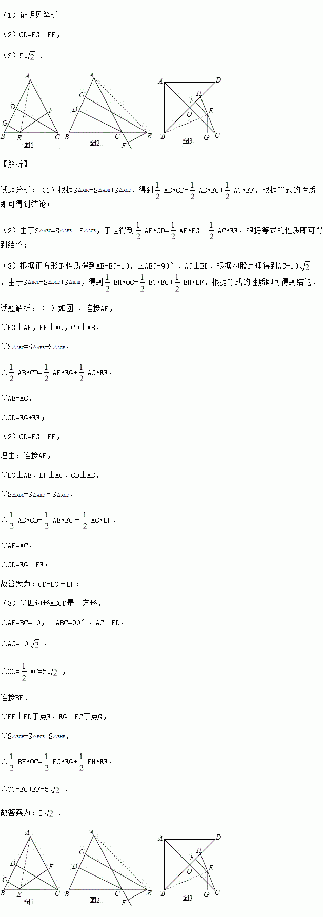(3)如图3,边长为10的正方形ABCD的对角线相交于点O、H在BD上,且BH=BC,连接CH,点E是CH上一点,EF⊥BD于点F,EG⊥BC于点G,则EF+EG= .