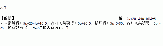 -5. 【解析】【解析】 9a+20-(4a-10)=5,去括号得:9a+20-4a+10=5,合并同类项得:5a+30=5,移项得:5a=5-30,合并同类项得:5a=-25,化系数为1得:a=-5.故答案为:-5.
