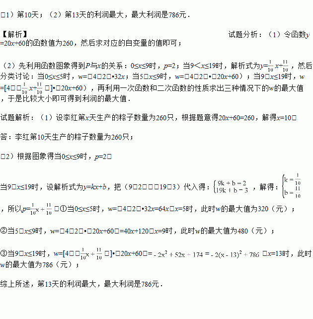(2)如图,设第x天生产的每只粽子的成本是p元,p与x之间的关系可用图中的函数图象来刻画,若李红第x天创造的利润为w元,求w与x之间的函数表达式,并求出第几天的利润最大?最大利润是多少元?(利润=出厂价﹣成本)