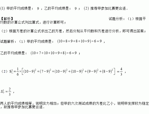 市射击队为从甲、乙两名运动员中选拔一人参加省比赛,对他们进行了六次测试,测试成绩如表