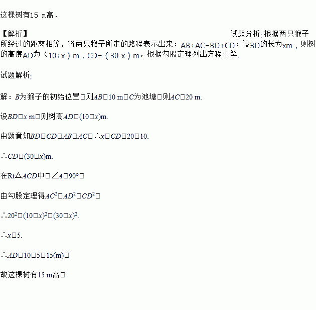 如图,在一棵树(AD)的10 m高处(B)有两只猴子,其中一只爬下树走向离树20 m(C)的池塘,而另一只则爬到树顶(D)后直扑池塘,如果两只猴子经过的路程相等,那么这棵树有多高?
