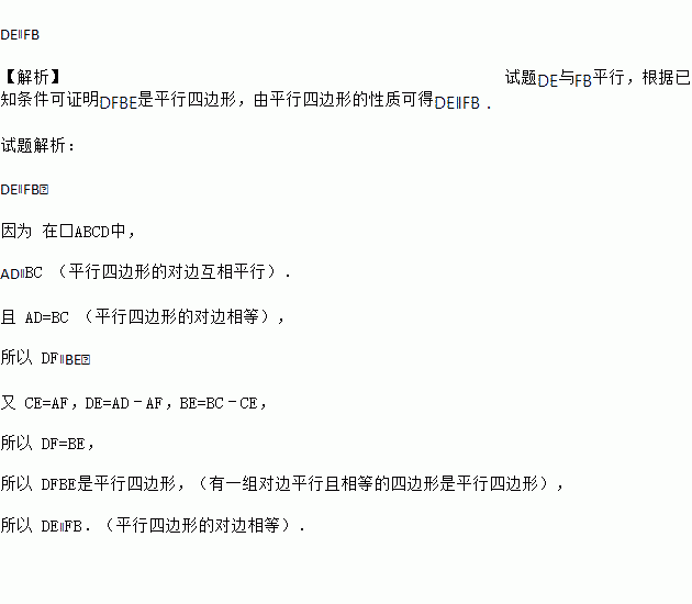 已知E、F分别是平行四边形ABCD的BC和DA边上的点,且CE=AF,问:DE与FB是否平行?说明理由.