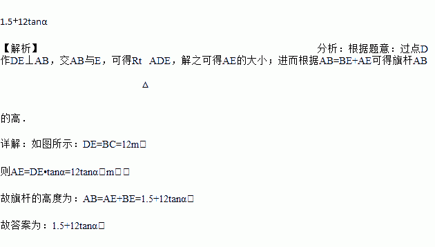 如图,某数学小组要测量校园内旗杆AB的高度,其中一名同学站在距离旗杆12米的点C处,测得旗杆顶端A的仰角为α,此时该同学的眼睛到地面的高CD为1.5米,则旗杆的高度为_____(米)(用含α的式子表示).