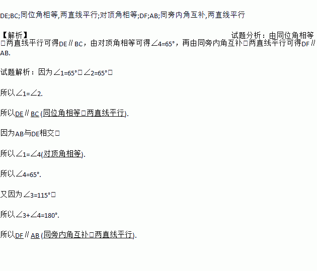 如图,∠1=65°,∠2=65°,∠3=115°.试说明:DE∥BC,DF∥AB.根据图形,完成下面的推理: