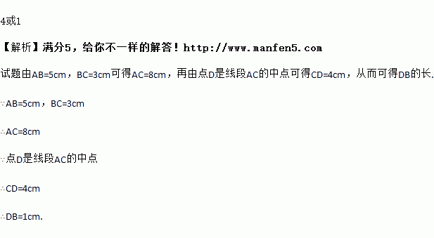 在一条直线上取A,B,C三点,使得AB=5cm,BC=3cm.如果点D是线段AC的中点,那么线段DB的长度是___________cm.