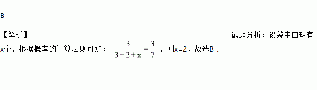 B 【解析】试题分析:设袋中白球有x个,根据概率的计算法则可知: ,则x=2,故选B.