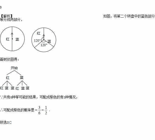 用图中两个可自由转动的转盘做“配紫色”游戏:分别旋转两个转盘,若其中一个转出红色,另一个转出蓝色即可配成紫色.那么可配成紫色的概率是( )