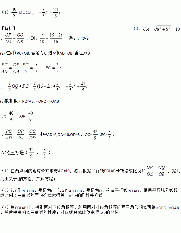 如图,在△OAB中,O为坐标原点,横、纵轴的单位长度相同,A、B的坐标分别为(8,6),(16,0),点P沿OA边从点O开始向终点A运动,速度每秒1个单位,点Q沿BO边从B点开始向终点O运动,速度每秒2个单位,如果P、Q同时出发,用t(秒)表示移动时间,当这两点中有一点到达自己的终点时,另一点也停止运动。求: