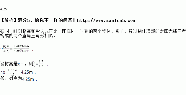 如图,同一时刻在阳光照射下,树的影子,小明的影子,已知小明的身高,则树高________.