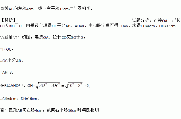 如图,⊙O的半径OC=10cm,直线l⊥CO,垂足为H,交⊙O于A,B两点,AB=16cm,直线l平移多少厘米时能与⊙O相切
