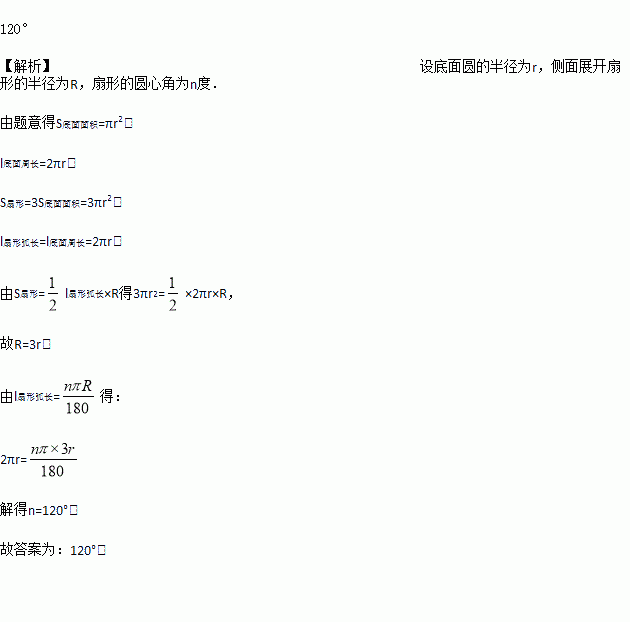 一个圆锥的侧面积是底面积的3倍,则此圆锥侧面展开图的圆心角为_______.
