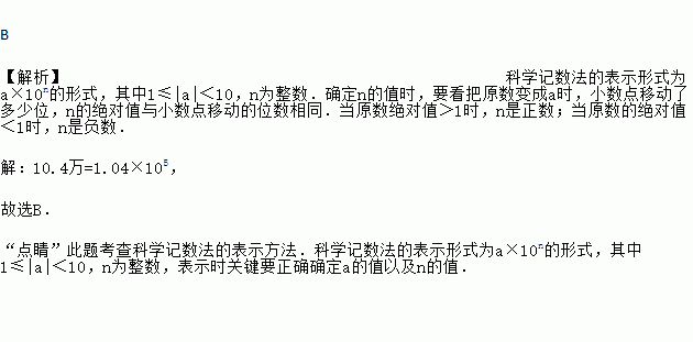 B 【解析】科学记数法的表示形式为a×10n的形式,其中1≤|a|<10,n为整数.确定n的值时,要看把原数变成a时,小数点移动了多少位,n的绝对值与小数点移动的位数相同.当原数绝对值>1时,n是正数;当原数的绝对值<1时,n是负数. 【解析】 10.4万=1.04×105, 故选B. “点睛”此题考查科学记数法的表示方法.科学记数法的表示形式为a×10n的形式,其中1≤...