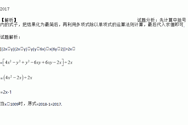 [(2x-y)(2x+y)+y(y-6x)+x(6y-2)]÷2x,其中x=1009.