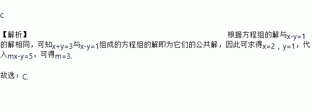 C 【解析】根据方程组的解与x-y=1的解相同,可知x+y=3与x-y=1组成的方程组的解即为它们的公共解,因此可求得x=2,y=1,代入mx-y=5,可得m=3. 故选:C.