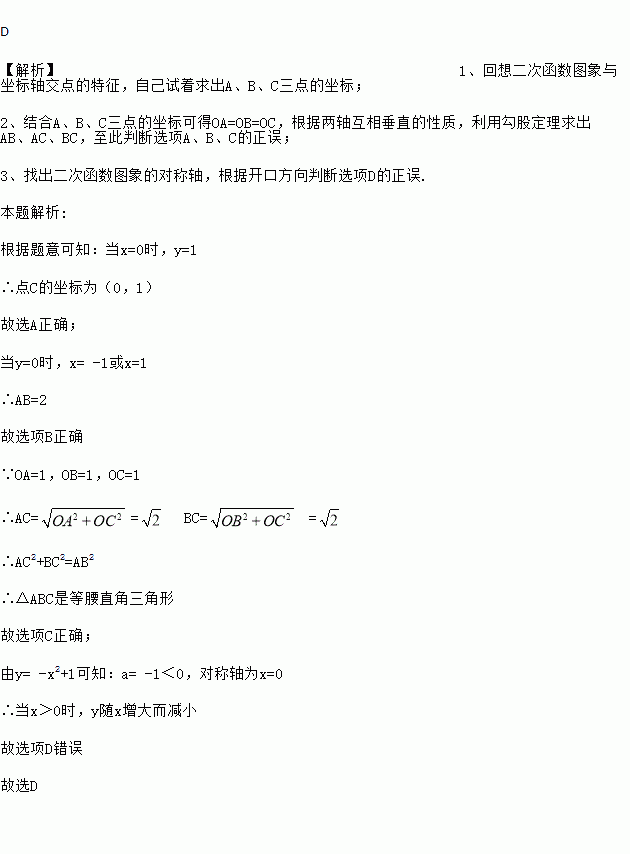 二次函数y=﹣x2+1的图象与x轴交于A、B两点,与y轴交于点C,下列说法错误的是( ).