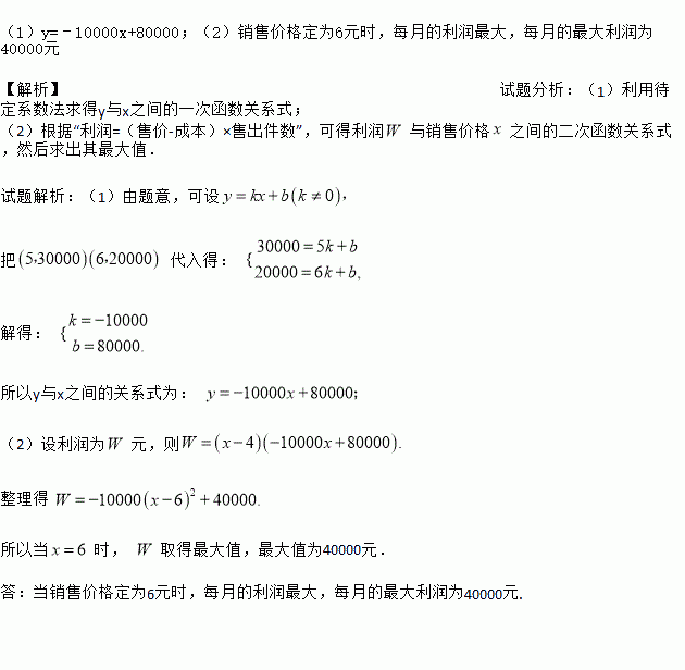 (1)y=﹣10000x+80000;(2)销售价格定为6元时,每月的利润最大,每月的最大利润为40000元 【解析】试题分析:(1)利用待定系数法求得y与x之间的一次函数关系式; (2)根据“利润=(售价-成本)×售出件数”,可得利润与销售价格之间的二次函数关系式,然后求出其最大值. 试题解析:(1)由题意,可设 把 代入得: 解得: 所以y与x之间的关系式为: ...