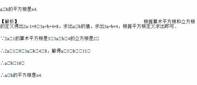 已知2a-1的算术平方根是3,3a+b+4的立方根是2,求a-b的平方根.