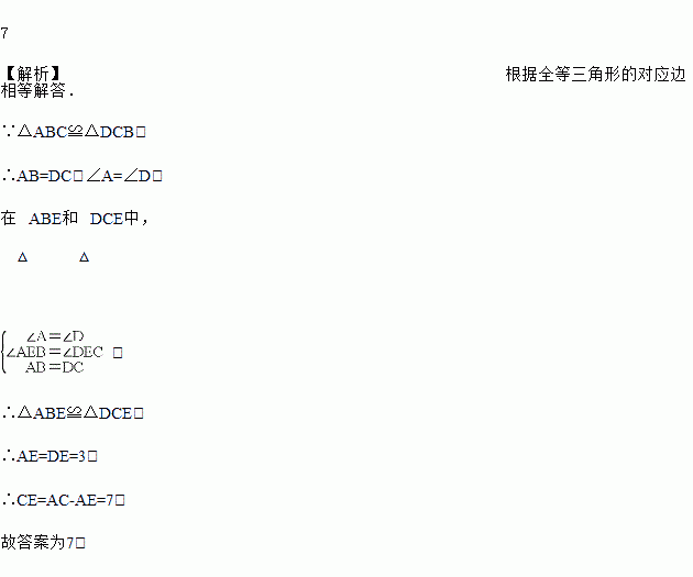 如图,△ABC≌△DCB,若AC=10,DE=3,则CE的长为________ .