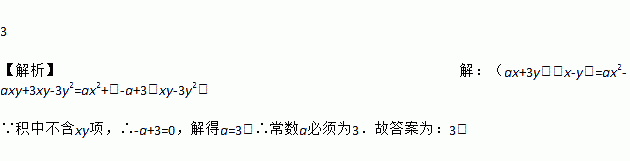 3 【解析】【解析】 (ax+3y)(x-y)=ax2-axy+3xy-3y2=ax2+(-a+3)xy-3y2. ∵积中不含xy项,∴-a+3=0,解得a=3,∴常数a必须为3.故答案为:3.