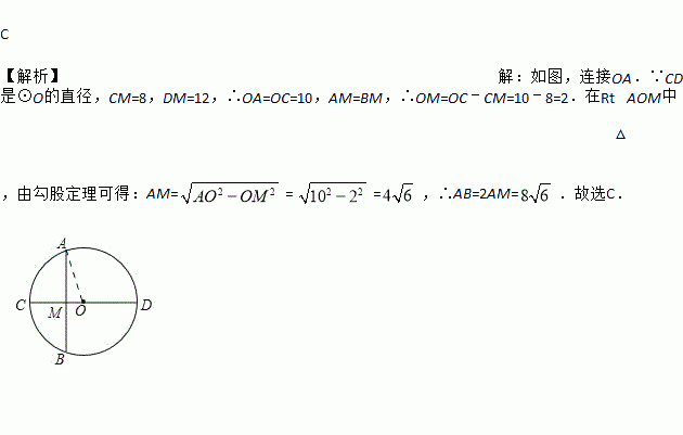 如图,CD是⊙O的直径,弦AB⊥CD,垂足为M,若CM=8,DM=12,则AB等于( )