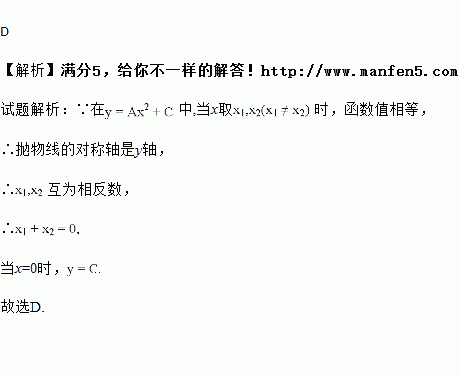 若二次函数y=Ax 2 +C,当x取x 1 ,x 2 (x 1 ≠x 2 )时函数值相等,则当x取x 1 +x 2 时,函数值为( )