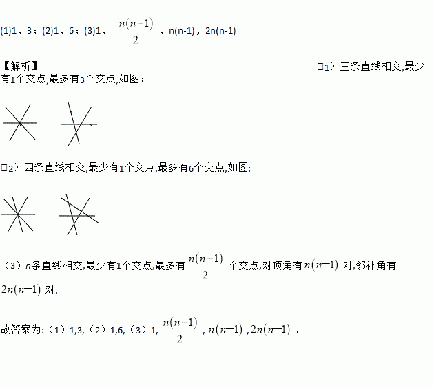 £¨1£©ÈýÌõÖ±ÏßÏཻ£¬×îÉÙÓÐ__________¸ö½»µã£¬×î¶àÓÐ__________¸ö½»µã£¬·Ö±ð»³öͼÐΣ¬²¢Êý³öͼÐÎÖеĶԶ¥½ÇºÍÁÚ²¹½ÇµÄ¶ÔÊý£»