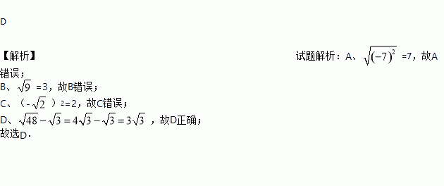 A. =﹣7 B. =±3 C. (﹣)2=4 D.