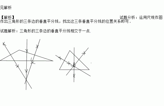 利用尺规作三角形的三条边的垂直平分线,观察这三条垂直平分线的位置关系,你发现了什么?再换一个三角形试一试.