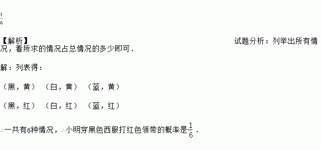 小明有黑色、白色、蓝色西服各一件,有红色、黄色领带各一条,从中分别取一件西服和一条领带,则小明穿黑色西服打红色领带的概率是 .