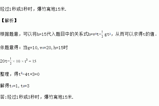 竖直上抛物体的高度h和时间t符合关系式h=v0t-gt2,其中重力加速度g以10米/秒2计算.爆竹点燃后以初速度v0=20米/秒上升,问经过多少时间爆竹离地15米?
