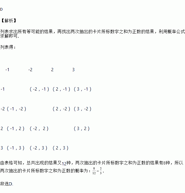 现有四张质地均匀,大小完全相同的卡片,在其正面分别标有数字﹣1,﹣2,2,3,把卡片背面朝上洗匀,从中随机抽出一张后,不放回,再从中随机抽出一张,则两次抽出的卡片所标数字之和为正数的概率为( )