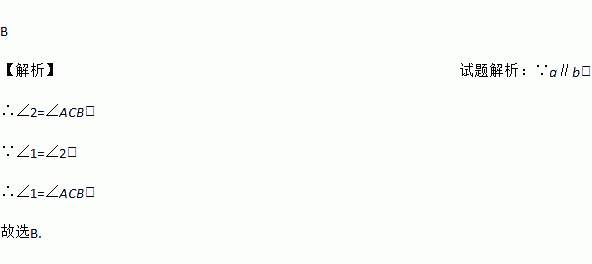B 【解析】试题解析:∵a∥b, ∴∠2=∠ACB, ∵∠1=∠2, ∴∠1=∠ACB, 故选B.