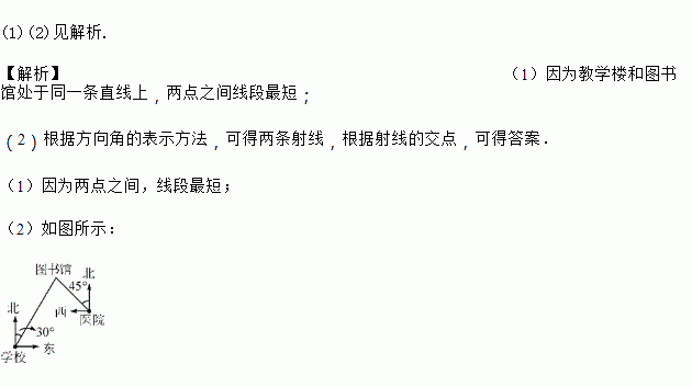 (2)在一张城市地图上,有学校、医院、图书馆三地,由于墨迹污染,图书馆的具体位置看不清,但知道图书馆在学校的北偏东30°方向,在医院的西北方向,你能确定图书馆的位置吗?请画出来.