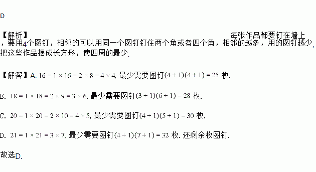 某班要在一面墙上同时展示数张形状、大小均相同的矩形绘画作品,将这些作品排成一个矩形(作品不完全重合),现需要在每张作品的四个角落都钉上图钉,如果作品有角落相邻,那么相邻的角落共享一枚图钉(例如,用9枚图钉将4张作品钉在墙上,如图),若有34枚图钉可供选用,则最多可以展示绘画作品( )