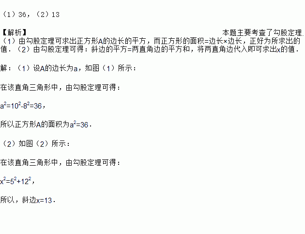 如图(1)、(2)中,(1)正方形A的面积为 .(2)斜边x= .