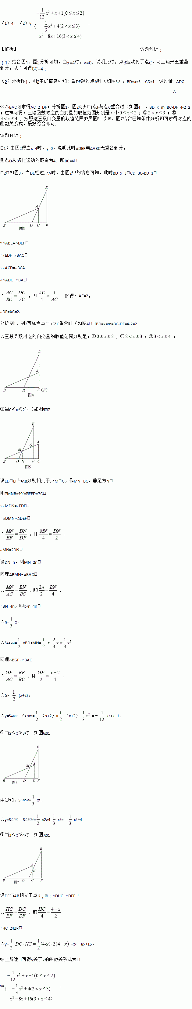 如图1,两个全等的△ABC和△DEF中,∠ACB=∠DFE=90°,AB=DE,其中点B和点D重合,点F在BC上,将△DEF沿射线BC平移,设平移的距离为x,平移后的图形与△ABC重合部分的面积为y,y关于x的函数图象如图2所示(其中0≤x≤m,m<x≤3,3<x≤4时,函数的解析式不同)