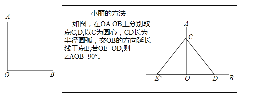 如图,已知∠AOB,请仿照小丽的方式,再用两种不同的方法判断∠AOB是否为直角(仅限用直尺和圆规).