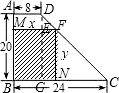 分析:本题可通过构建相似三角形,运用线段间的比例来得出x、y的比例关系.可作梯形的高DG交MF于E,EF∥GC,那么不难得出△DGC∽△DEF.于是可得出DE、EF、DG、GC的比例关系,然后用x、y表示出DE、EF,又知道了DG、CG的值,那么就可知道x、y的比例关系,然后就能求出x、y的值(根据8<x<24且0<y<20),得出矩形的面积了.