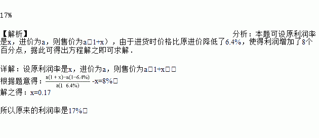 某商场经销一种商品,由于进货时价格比原进价降低了6.4%,使得利润率增加了8个百分点,那么经销这种商品原来的利润率是_____%(注:利润率=×100%).